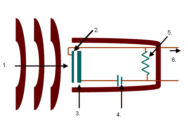 1. geluid – 2. membraan – 3. achterplaat van condensator – 4. voeding – 5. weerstand – 6. signaal
